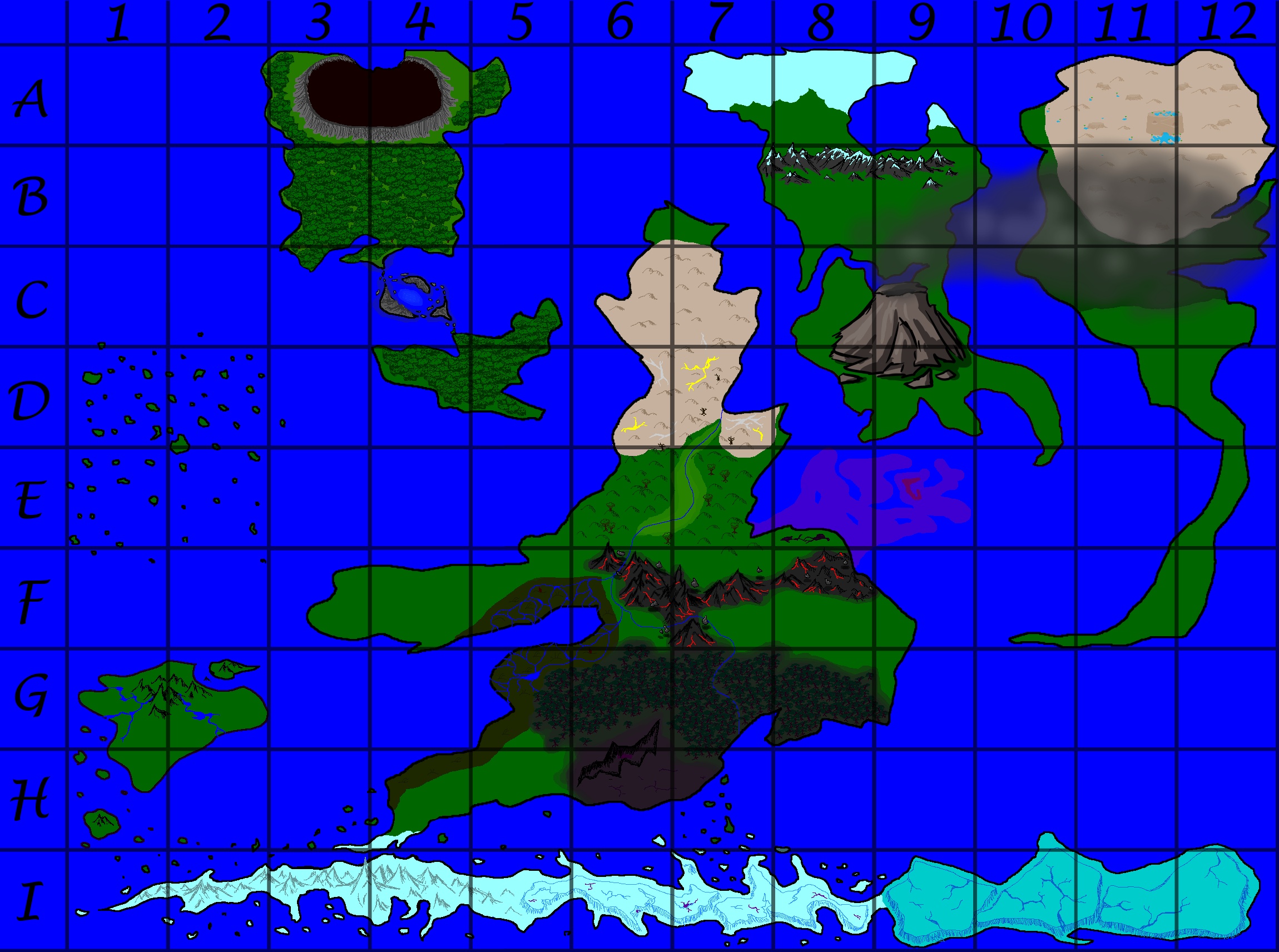 A second LARGE ANGRY VOLCANO forms exactly at "C8.9 and D8,9,10", which is exact where Donnie's island has formed. This volcano should be placed so that it screws the island over as much as possible (probably right smack in the center.)